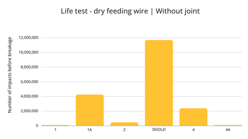 A test performed by the Danish Institute of Technology revealed a significantly longer lifetime of SKIOLD wires compared to competing alternatives, as shown in the diagram above.